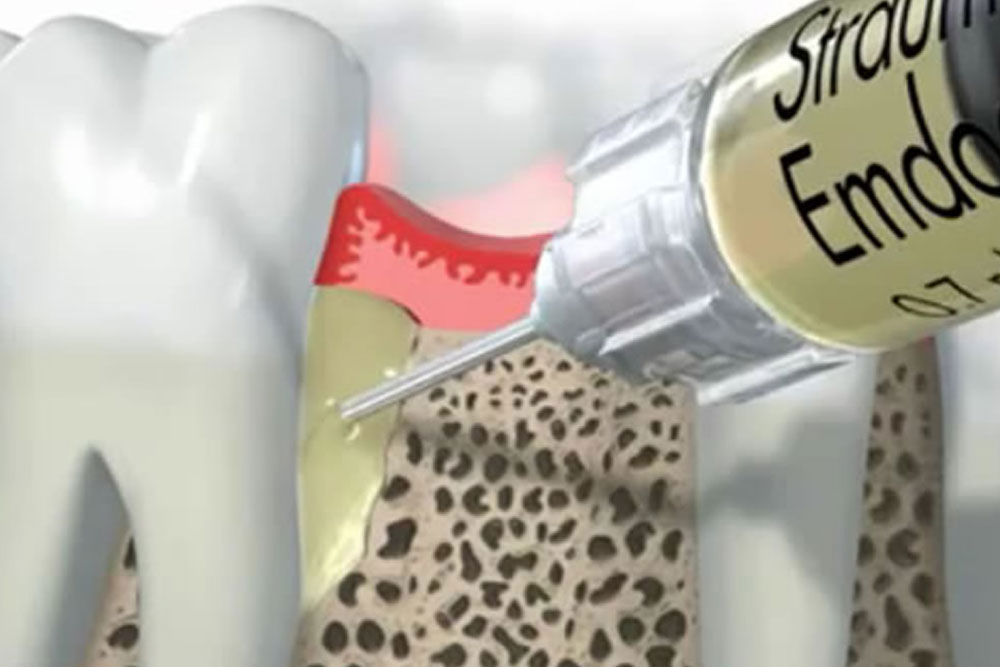歯周病によって歯茎や歯槽骨(歯を支える骨)が溶かされ、歯の動揺が激しい場合にはエムドゲインゲルによる歯周組織再生療法を実施いたします。エムドゲインゲルには、歯の発生時に重要な働きをするタンパク質が含まれています。歯茎や骨が少なくなった部分にエムドゲインゲル塗布することによって、失った歯周組織の再生を促し、もう一度歯を支えられる状態に戻します。